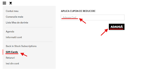 3. In sectiunea CONTUL MEU, apasa pe Gift Cards si adauga codul in caseta destinata. Apoi apasa pe ADAUGA.