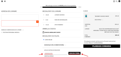 4. Pune produsele dorite in cos, apasa pe FINALIZATI COMANDA, iar la check-out, dupa ce ai introdus toate datele de facturare si de livrare si ai selectat modalitatea de livrare si de plata dorite, apasa pe caseta ADAUGA COD. Va aparea codul gift card-ului tau pe care trebuie sa-l selectezi iar apoi sa apesi pe ADAUGA CODUL.